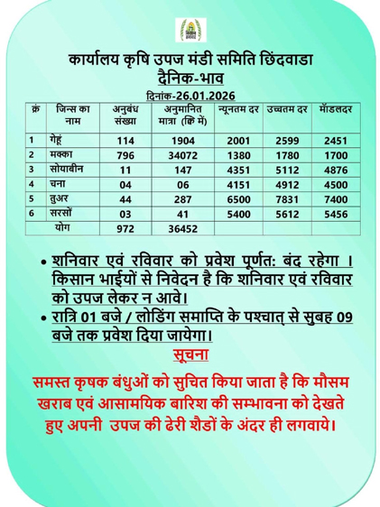 छिंदवाड़ा कृषि उपज मंडी में 26 फरवरी के जिंस के भाव